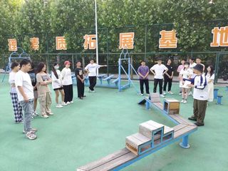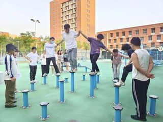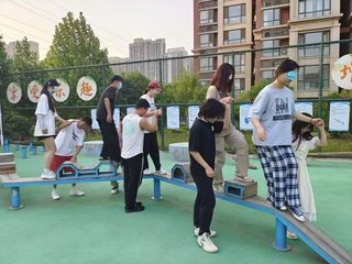 本次室外素质拓展涵盖“携手并进”“梅花桩”“盲目障碍”“模拟电网”等环节组成,由蒲公英使者和同学们参与的就“人际交往”和“压力应对”方面内容进行专题讲座和室外的素质拓展小游戏:第一是模拟电网,需同学们相互交流、配合寻求过电网的最佳方法,培养团队行动前调查研究、认真计划的工作作风;第二是盲目障碍是在队友提示下,蒙眼在高低错落、左右弯曲的板上走完全程以此增强团队合作精神,培养人际信任感;第三是梅花桩则需要团队成员两手紧握,队员依次走过梅花桩,建立团队成员间的沟通与默契。第四携手并进以两人人一组,在支点高低错落的晃板上,有创造性的及时选择落脚的支点,培养在共同解决问题时团队成员步调的一致性。