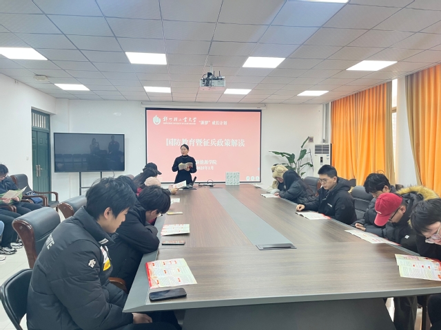 会上,付玉老师详细介绍了今年的征兵政策、报名流程以及相关优待措施。并强调,学校会全力支持有意向参军的同学,为他们提供全方位的服务和保障。也呼吁广大同学要积极响应国家号召,踊跃报名参军,用实际行动践行爱国主义精神。随后,李辉老师深刻阐述了国防建设对大学生群体的需求以及对国家安全和社会稳定的重要意义,强大的国防是维护国家利益、和平、发展的坚实后盾。并寄语在场有志青年,要将个人梦想与国家需要紧密结合,勇于担当时代赋予的使命,为实现中华民族伟大复兴的中国梦贡献青春力量。最后,宣讲会播放了征兵宣传片,生动展现了老一辈革命军人的光辉事迹,以及当代青年在军营中的风采和成就,进一步坚定了同学们投身国防事业的决心和信心。