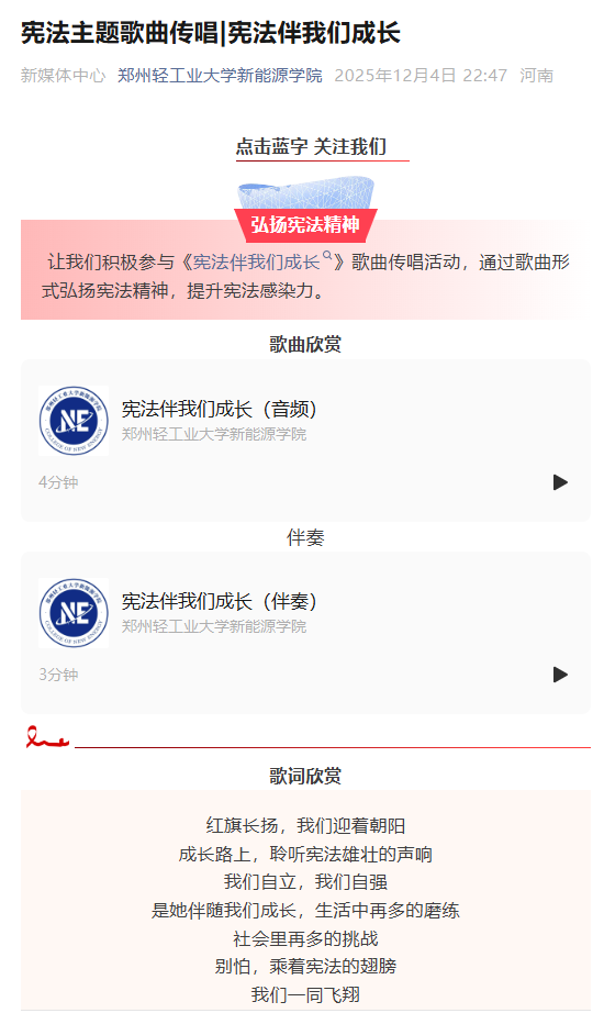 与此同时,必赢 依托官方微信公众号推出“宪法宣传周”专题学习栏目,推送宪法学习科普、《宪法版我们成长》传唱等内容,通过图文、音画结合的形式,将复杂的法律知识转化为通俗易懂的生活指引。